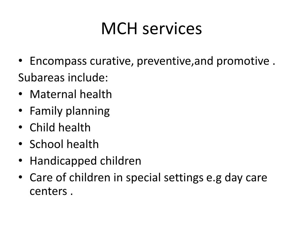 MCH services • Encompass curative, preventive,andpromotive . Subareas include: • Maternal health • Family planning • Child health • School health • Handicapped children • Care of children in special settings e.g day care centers .