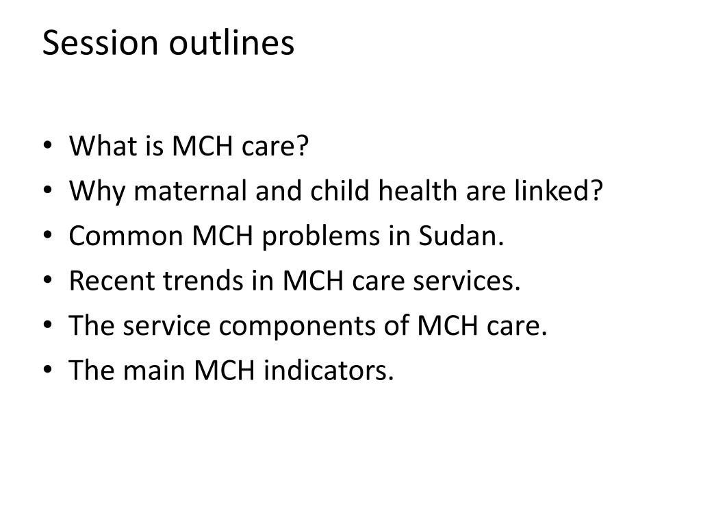 Session outlines • What is MCH care? • Why maternal and child health are linked? • Common MCH problems in Sudan. • Recent trends in MCH care services. • The service components of MCH care. • The main MCH indicators.