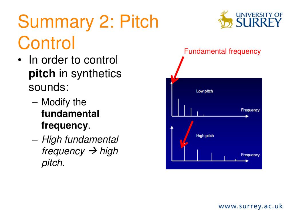 Summary 2: Pitch Control Fundamental frequency • In order to control pitch in synthetics sounds: • Modify the fundamental frequency. • High fundamental frequency high pitch.