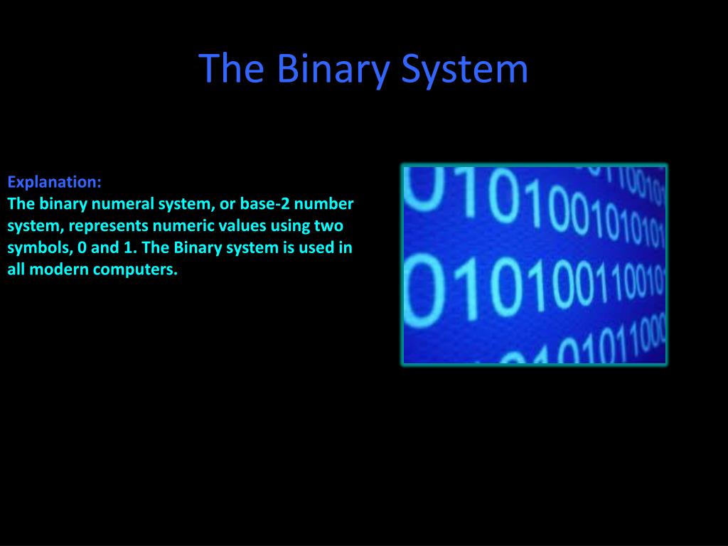 The Binary System Explanation: The binary numeral system, or base-2 number system, represents numeric values using two symbols, 0 and 1. The Binary system is used in all modern computers.