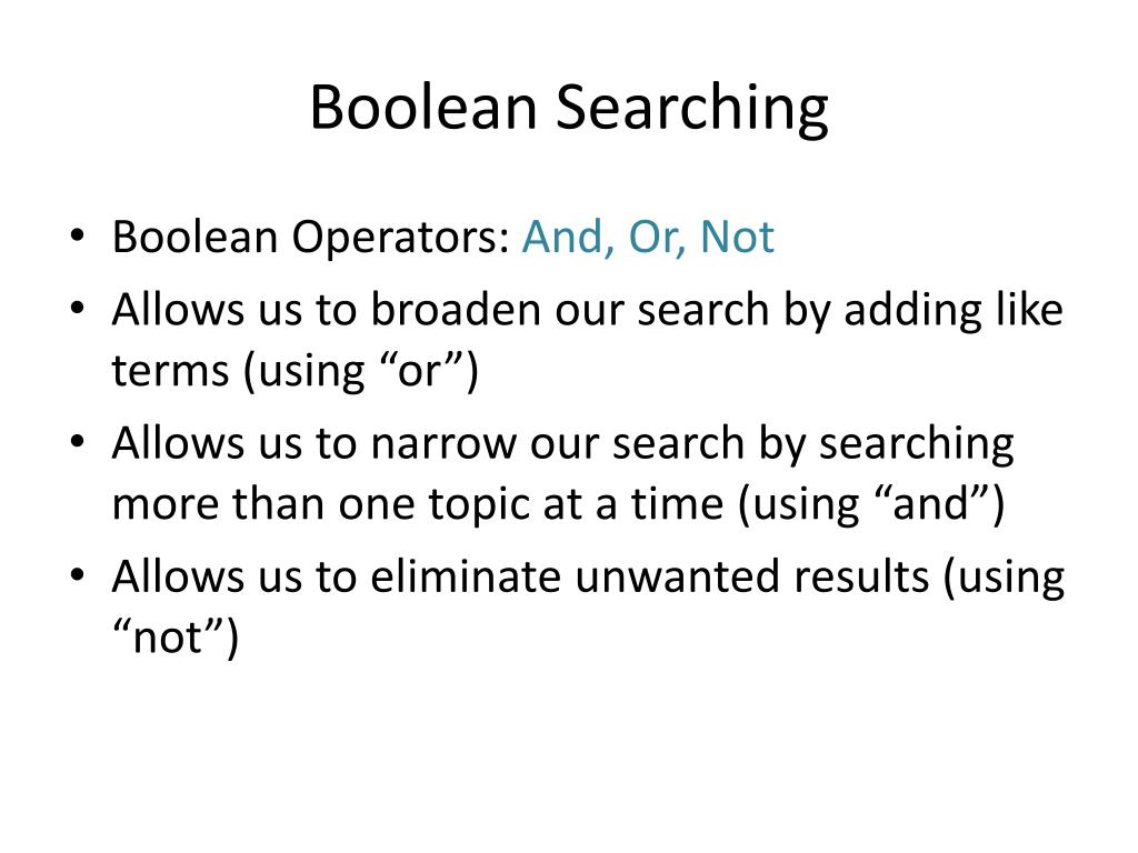 Boolean Searching • Boolean Operators: And, Or, Not • Allows us to broaden our search by adding like terms (using “or”) • Allows us to narrow our search by searching more than one topic at a time (using “and”) • Allows us to eliminate unwanted results (using “not”)