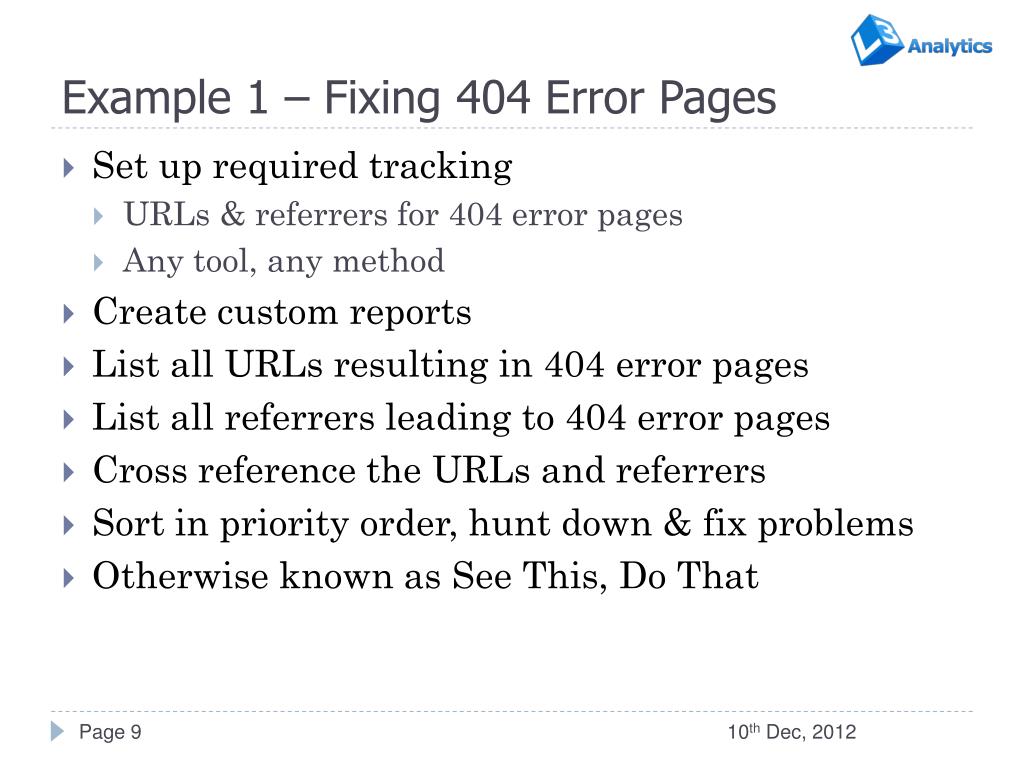Example 1 – Fixing 404 Error Pages • Set up required tracking • URLs & referrers for 404 error pages • Any tool, any method • Create custom reports • List all URLs resulting in 404 error pages • List all referrers leading to 404 error pages • Cross reference the URLs and referrers • Sort in priority order, hunt down & fix problems • Otherwise known as See This, Do That