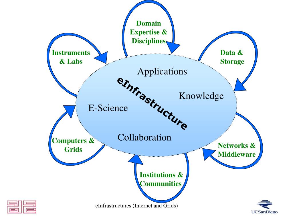 Domain Expertise & Disciplines Instruments & Labs Data & Storage Applications Knowledge eInfrastructure E-Science Collaboration Computers & Grids Networks & Middleware Institutions & Communities eInfrastructures (Internet and Grids)