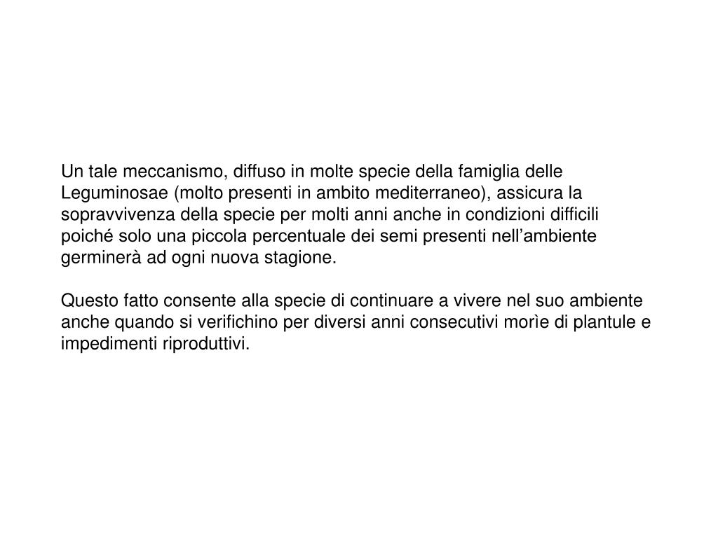 Un tale meccanismo, diffuso in molte specie della famiglia delle Leguminosae (molto presenti in ambito mediterraneo), assicura la sopravvivenza della specie per molti anni anche in condizioni difficili poiché solo una piccola percentuale dei semi presenti nell’ambiente germinerà ad ogni nuova stagione. Questo fatto consente alla specie di continuare a vivere nel suo ambiente anche quando si verifichino per diversi anni consecutivi morìe di plantule e impedimenti riproduttivi.