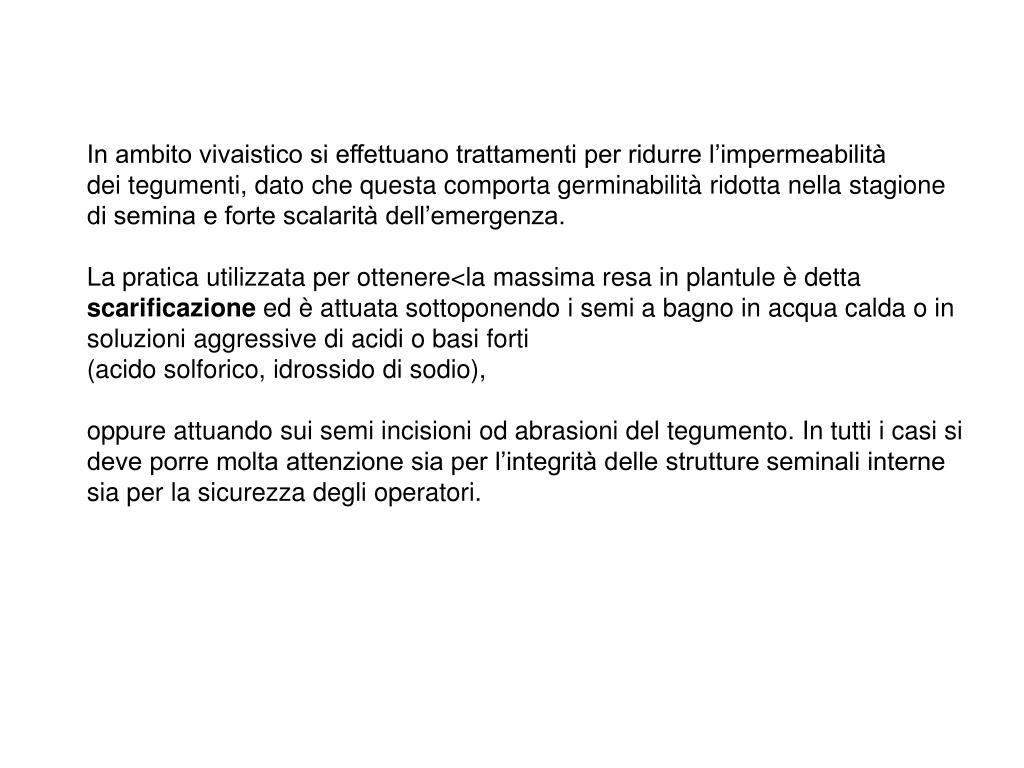 In ambito vivaistico si effettuano trattamenti per ridurre l’impermeabilità dei tegumenti, dato che questa comporta germinabilità ridotta nella stagione di semina e forte scalarità dell’emergenza. La pratica utilizzata per ottenere<la massima resa in plantule è detta scarificazione ed è attuata sottoponendo i semi a bagno in acqua calda o in soluzioni aggressive di acidi o basi forti (acido solforico, idrossido di sodio), oppure attuando sui semi incisioni od abrasioni del tegumento. In tutti i casi si deve porre molta attenzione sia per l’integrità delle strutture seminali interne sia per la sicurezza degli operatori.