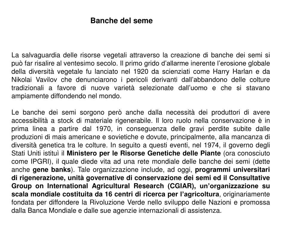 Banche del seme La salvaguardia delle risorse vegetali attraverso la creazione di banche dei semi si può far risalire al ventesimo secolo. Il primo grido d’allarme inerente l’erosione globale della diversità vegetale fu lanciato nel 1920 da scienziati come Harry Harlan e da Nikolai Vavilov che denunciarono i pericoli derivanti dall’abbandono delle colture tradizionali a favore di nuove varietà selezionate dall’uomo e che si stavano ampiamente diffondendo nel mondo. Le banche dei semi sorgono però anche dalla necessità dei produttori di avere accessibilità a stock di materiale rigenerabile. Il loro ruolo nella conservazione è in prima linea a partire dal 1970, in conseguenza delle gravi perdite subite dalle produzioni di mais americane e sovietiche e dovute, principalmente, alla mancanza di diversità genetica tra le colture. In seguito a questi eventi, nel 1974, il governo degli Stati Uniti istituì il Ministero per le Risorse Genetiche delle Piante (ora conosciuto come IPGRI), il quale diede vita ad una rete mondiale delle banche dei semi (dette anche gene banks). Tale organizzazione include, ad oggi, programmi universitari di rigenerazione, unità governative di conservazione dei semi ed il Consultative Group on International Agricultural Research (CGIAR), un’organizzazione su scala mondiale costituita da 16 centri di ricerca per l’agricoltura, originariamente fondata per diffondere la Rivoluzione Verde nello sviluppo delle Nazioni e promossa dalla Banca Mondiale e dalle sue agenzie internazionali di assistenza.