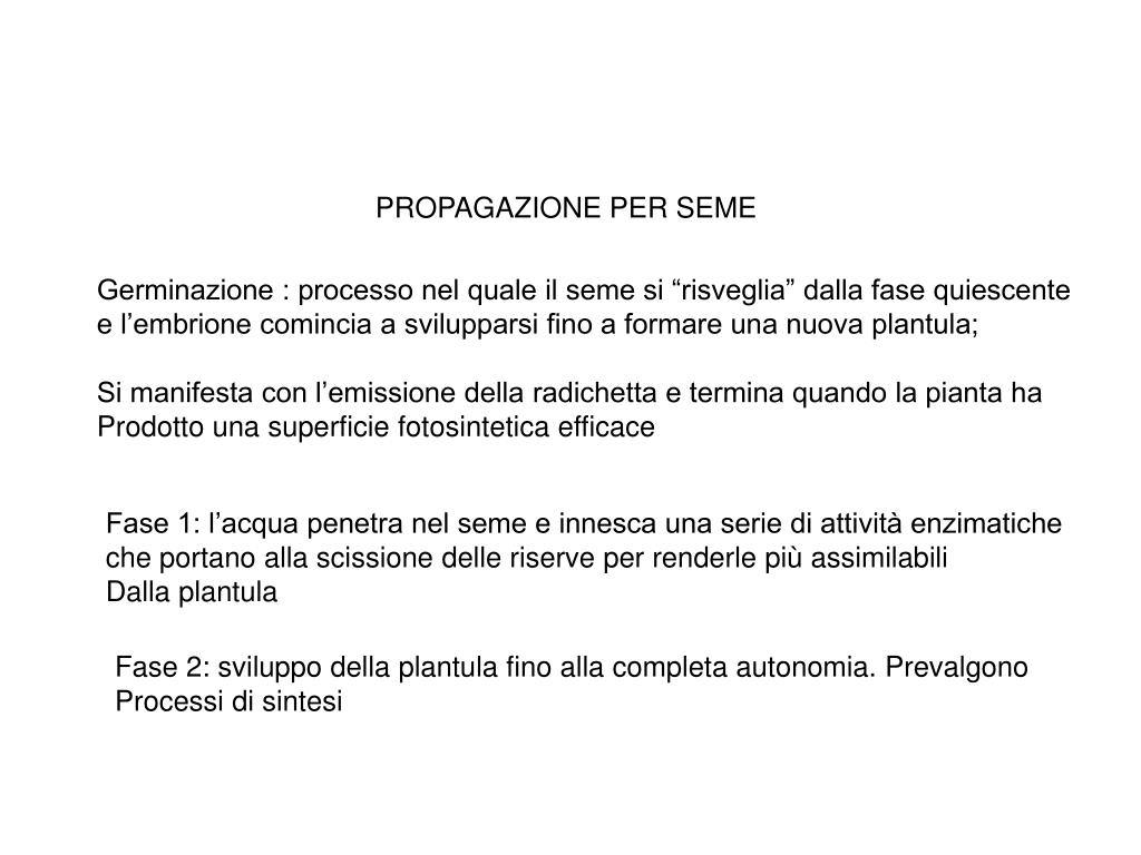 PROPAGAZIONE PER SEME Germinazione : processo nel quale il seme si “risveglia” dalla fase quiescente e l’embrione comincia a svilupparsi fino a formare una nuova plantula; Si manifesta con l’emissione della radichetta e termina quando la pianta ha Prodotto una superficie fotosintetica efficace Fase 1: l’acqua penetra nel seme e innesca una serie di attività enzimatiche che portano alla scissione delle riserve per renderle più assimilabili Dalla plantula Fase 2: sviluppo della plantula fino alla completa autonomia. Prevalgono Processi di sintesi