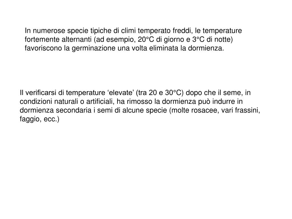In numerose specie tipiche di climi temperato freddi, le temperature fortemente alternanti (ad esempio, 20°C di giorno e 3°C di notte) favoriscono la germinazione una volta eliminata la dormienza. Il verificarsi di temperature ‘elevate’ (tra 20 e 30°C) dopo che il seme, in condizioni naturali o artificiali, ha rimosso la dormienza può indurre in dormienza secondaria i semi di alcune specie (molte rosacee, vari frassini, faggio, ecc.)