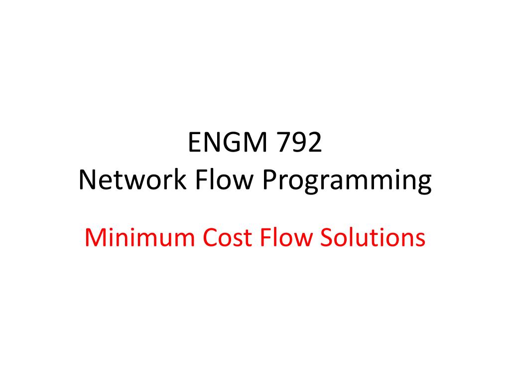 ENGM 792 Network Flow Programming. Minimum Cost Flow Solutions. Minimum Cost Flow Solutions. Primal Algorithm Find an initial network flow that satisfies primal feasibility Determine is network is optimal. If so, stop. If not, go to 3. Modify network flow, return to step 2.