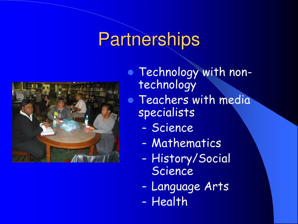 Partnerships • Technology with non-technology • Teachers with media specialists • Science • Mathematics • History/Social Science • Language Arts • Health