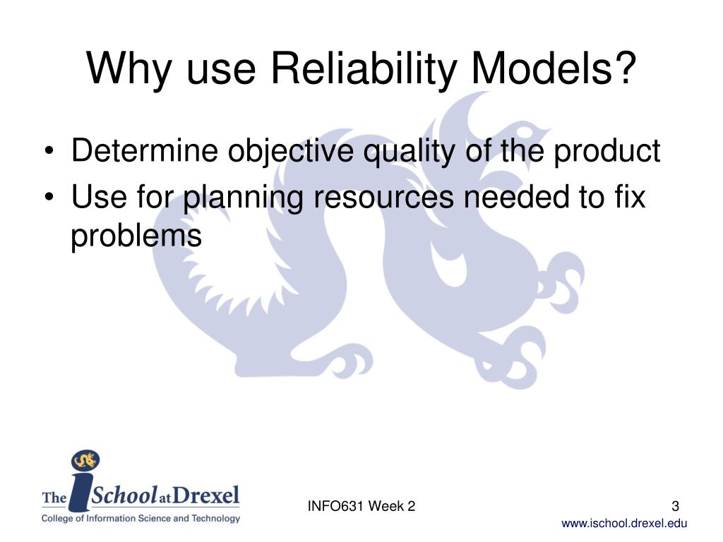 Why use Reliability Models? • Determine objective quality of the product • Use for planning resources needed to fix problems INFO631 Week 2