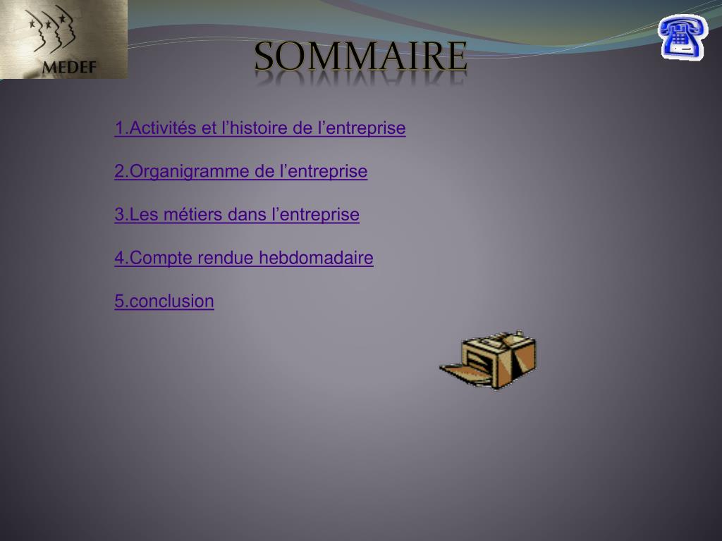 sommaire 1.Activités et l’histoire de l’entreprise 2.Organigramme de l’entreprise 3.Les métiers dans l’entreprise 4.Compte rendue hebdomadaire 5.conclusion