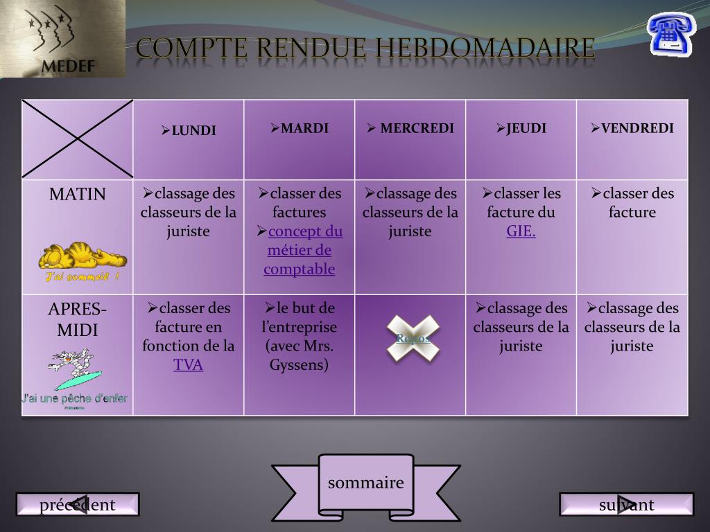 Les metiés dans l’entreprise • Comptable : Un comptable est chargé de tenir les compte d’une entreprise . L’entreprise ou j’ai fait mon stage reçoit de nombreuse facture et de demande de paiement , pour le gaz ou encore l’électricité (dont ce charge le GIE). • Par exemple, un vendeur de chaussure (qui a sa propre entreprise) ce doit de savoir faire un minimum de comptabilité pour pouvoir vendre selon ses besoins. Si le vendeur n’a aucune expérience niveau comptabilité il vaut mieux qu’il embauche son propre comptable, car si personne ne s’occupe des compte de l’entreprise, elle risque de faire faillite. sommaire précédent suivant