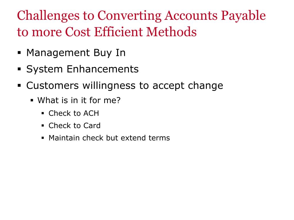 Challenges to Converting Accounts Payable to more Cost Efficient Methods • Management Buy In • System Enhancements • Customers willingness to accept change • What is in it for me? • Check to ACH • Check to Card • Maintain check but extend terms