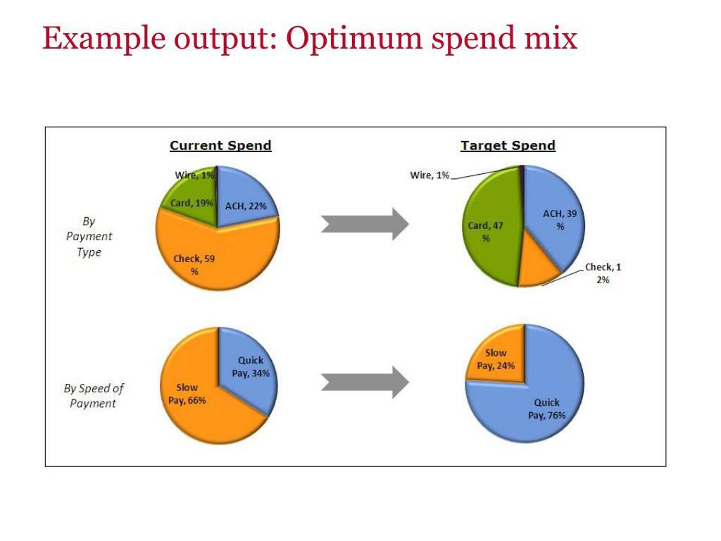 Payables Optimization Analysis Overview 1.Gather Data: Master Vendor File is uploaded 2.Control Data Review: Cost per disbursement, DPO, float, cost of funds, discounts available, average ticket, quick pay vs. slow pay. 3. Output shows total hard dollar savings, broken out by payment issuance savings, cost of funds impact, additional rebate and early payment discount all based on a best-in-class target mix 4. Recommended actions are tailored to improve trading partner relationships