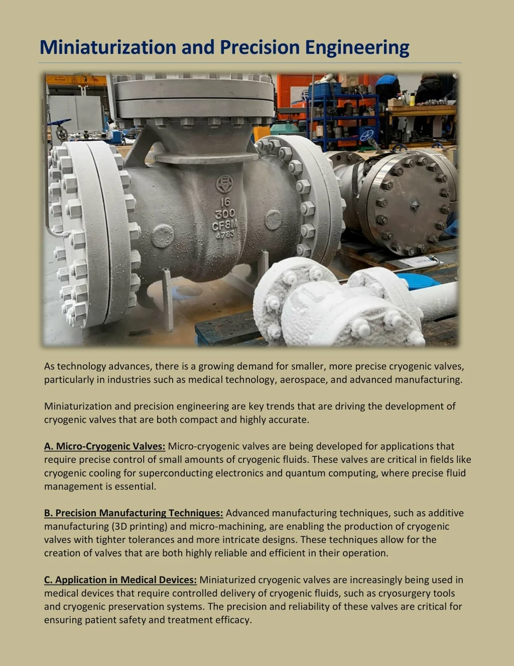 Miniaturization and Precision Engineering As technology advances, there is a growing demand for smaller, more precise cryogenic valves, particularly in industries such as medical technology, aerospace, and advanced manufacturing. Miniaturization and precision engineering are key trends that are driving the development of cryogenic valves that are both compact and highly accurate. A. Micro-Cryogenic Valves: Micro-cryogenic valves are being developed for applications that require precise control of small amounts of cryogenic fluids. These valves are critical in fields like cryogenic cooling for superconducting electronics and quantum computing, where precise fluid management is essential. B. Precision Manufacturing Techniques: Advanced manufacturing techniques, such as additive manufacturing (3D printing) and micro-machining, are enabling the production of cryogenic valves with tighter tolerances and more intricate designs. These techniques allow for the creation of valves that are both highly reliable and efficient in their operation. C. Application in Medical Devices: Miniaturized cryogenic valves are increasingly being used in medical devices that require controlled delivery of cryogenic fluids, such as cryosurgery tools and cryogenic preservation systems. The precision and reliability of these valves are critical for ensuring patient safety and treatment efficacy.