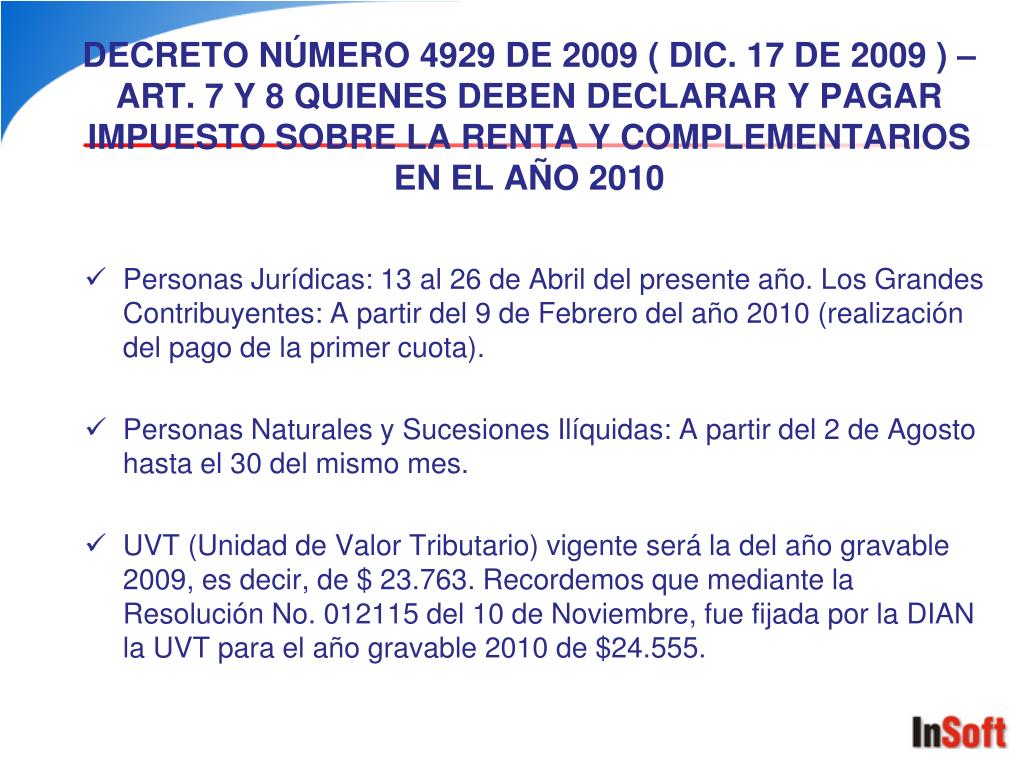 DECRETO NÚMERO 4929 DE 2009( DIC. 17 DE 2009 ) – ART. 7 Y 8QUIENES DEBEN DECLARAR Y PAGAR IMPUESTO SOBRE LA RENTA Y COMPLEMENTARIOS EN EL AÑO 2010 • Personas Jurídicas: 13 al 26 de Abril del presente año. Los Grandes Contribuyentes: A partir del 9 de Febrero del año 2010 (realización del pago de la primer cuota). • Personas Naturales y Sucesiones Ilíquidas: A partir del 2 de Agosto hasta el 30 del mismo mes. • UVT (Unidad de Valor Tributario) vigente será la del año gravable 2009, es decir, de $ 23.763. Recordemos que mediante la Resolución No. 012115 del 10 de Noviembre, fue fijada por la DIAN la UVT para el año gravable 2010 de $24.555.