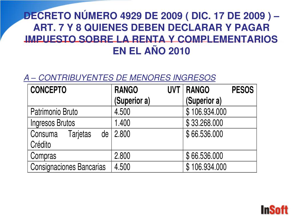 DECRETO NÚMERO 4929 DE 2009( DIC. 17 DE 2009 ) – ART. 7 Y 8QUIENES DEBEN DECLARAR Y PAGAR IMPUESTO SOBRE LA RENTA Y COMPLEMENTARIOS EN EL AÑO 2010 A – CONTRIBUYENTES DE MENORES INGRESOS