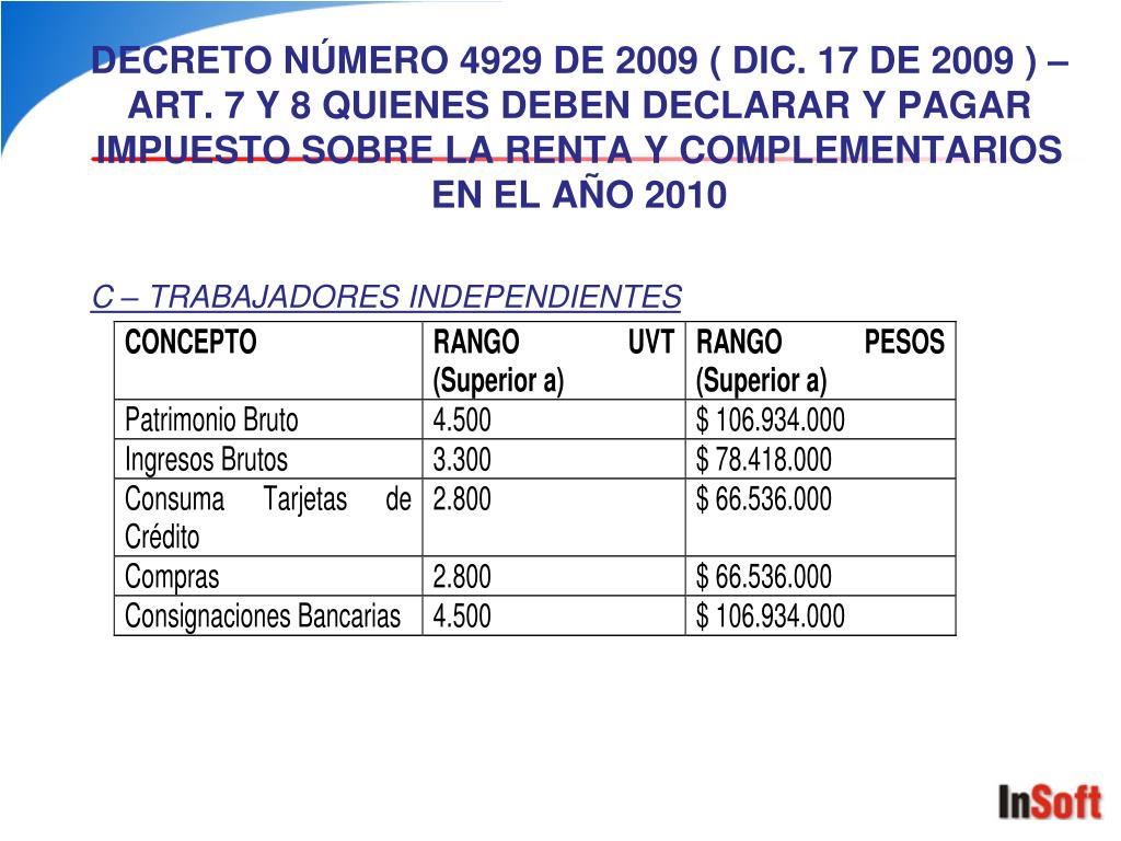 DECRETO NÚMERO 4929 DE 2009( DIC. 17 DE 2009 ) – ART. 7 Y 8QUIENES DEBEN DECLARAR Y PAGAR IMPUESTO SOBRE LA RENTA Y COMPLEMENTARIOS EN EL AÑO 2010 C – TRABAJADORES INDEPENDIENTES