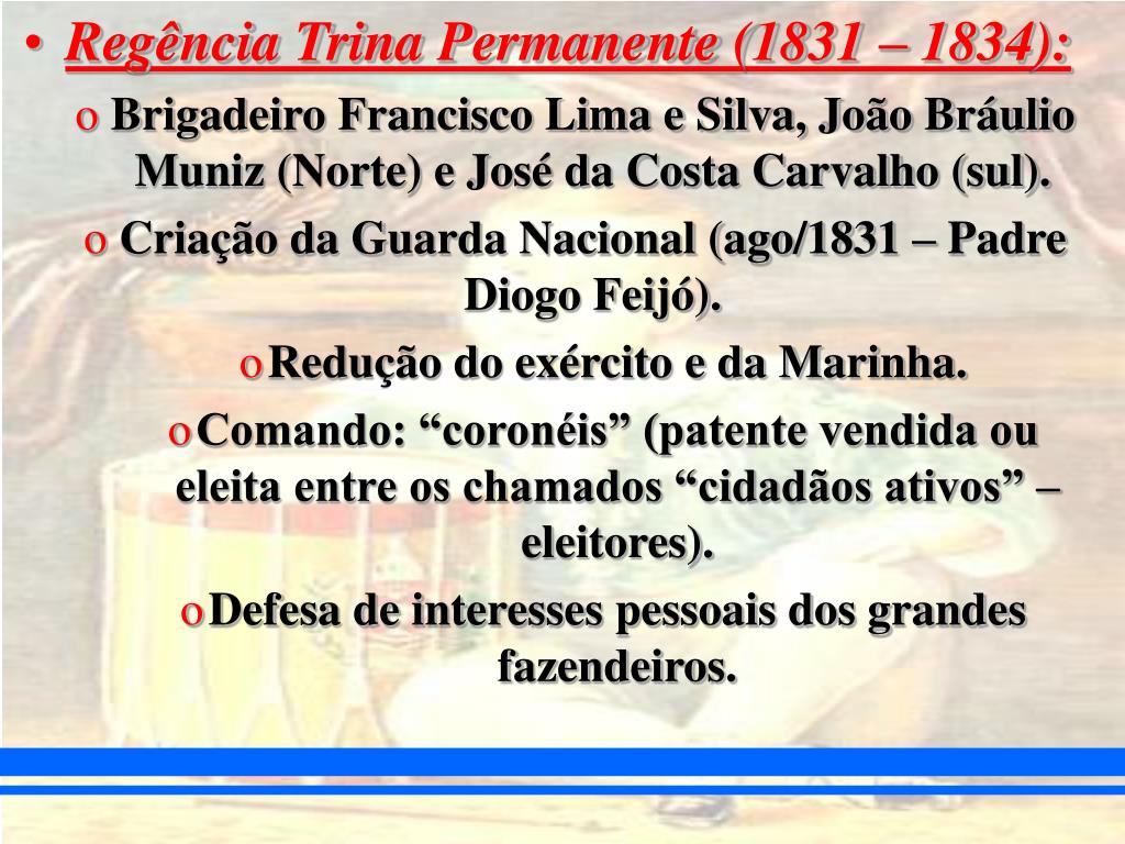 Regência Trina Permanente (1831 – 1834): • Brigadeiro Francisco Lima e Silva, João Bráulio Muniz (Norte) e José da Costa Carvalho (sul). • Criação da Guarda Nacional (ago/1831 – Padre Diogo Feijó). • Redução do exército e da Marinha. • Comando: “coronéis” (patente vendida ou eleita entre os chamados “cidadãos ativos” – eleitores). • Defesa de interesses pessoais dos grandes fazendeiros.
