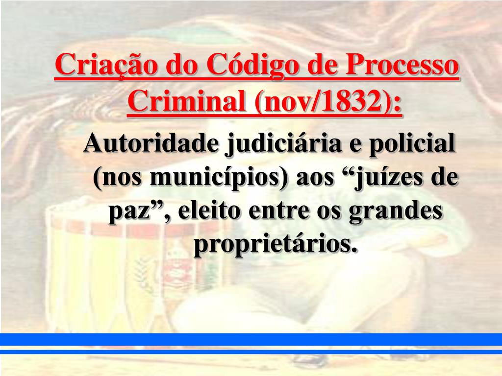 Criação do Código de Processo Criminal (nov/1832): Autoridade judiciária e policial (nos municípios) aos “juízes de paz”, eleito entre os grandes proprietários.