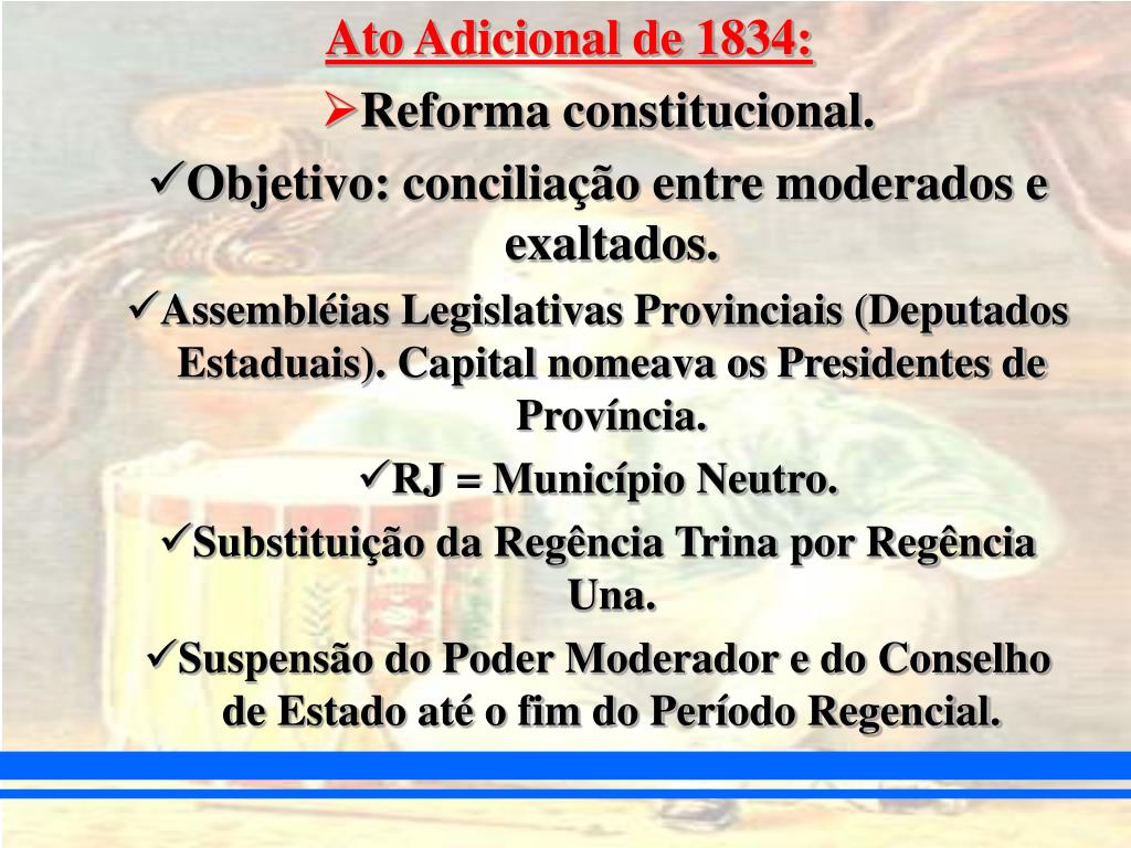 Ato Adicional de 1834: • Reforma constitucional. • Objetivo: conciliação entre moderados e exaltados. • Assembléias Legislativas Provinciais (Deputados Estaduais). Capital nomeava os Presidentes de Província. • RJ = Município Neutro. • Substituição da Regência Trina por Regência Una. • Suspensão do Poder Moderador e do Conselho de Estado até o fim do Período Regencial.