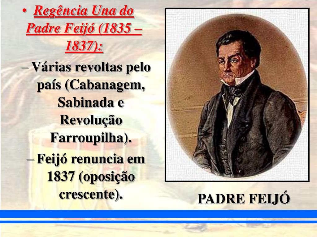 Regência Una do Padre Feijó (1835 – 1837): • Várias revoltas pelo país (Cabanagem, Sabinada e Revolução Farroupilha). • Feijó renuncia em 1837 (oposição crescente). PADRE FEIJÓ
