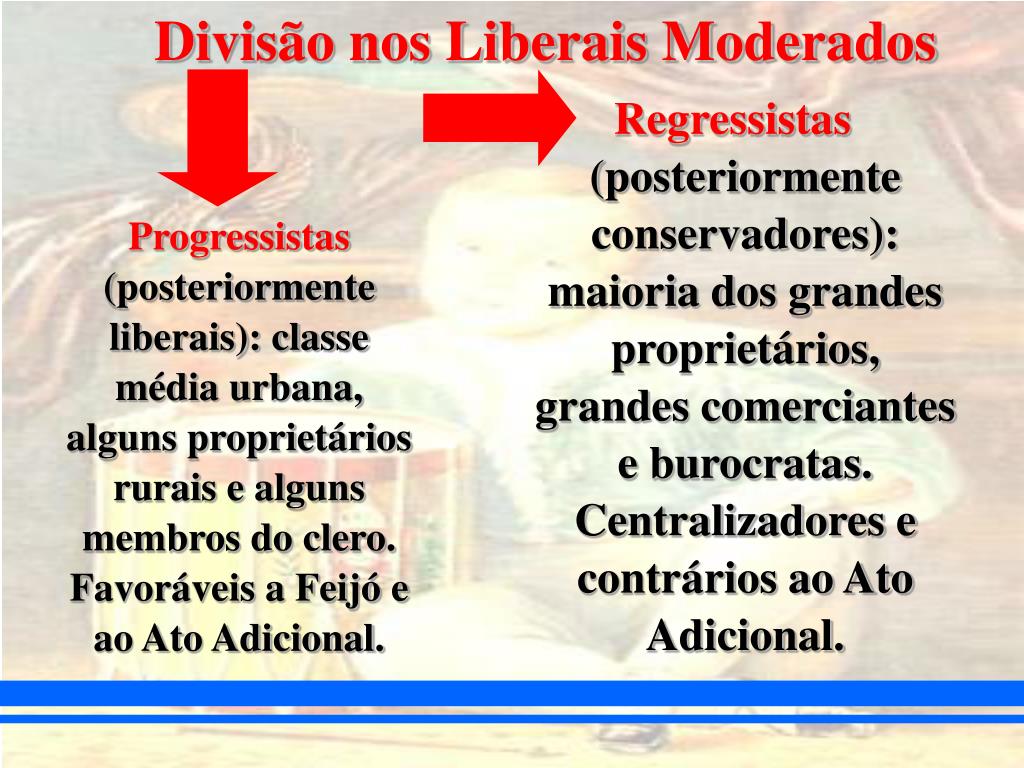 Divisão nos Liberais Moderados Regressistas (posteriormente conservadores): maioria dos grandes proprietários, grandes comerciantes e burocratas. Centralizadores e contrários ao Ato Adicional. Progressistas (posteriormente liberais): classe média urbana, alguns proprietários rurais e alguns membros do clero. Favoráveis a Feijó e ao Ato Adicional.