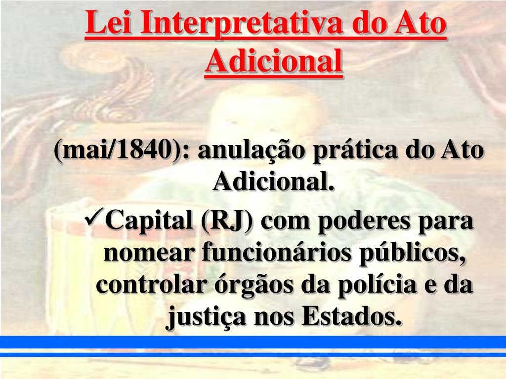 Lei Interpretativa do Ato Adicional (mai/1840): anulação prática do Ato Adicional. • Capital (RJ) com poderes para nomear funcionários públicos, controlar órgãos da polícia e da justiça nos Estados.