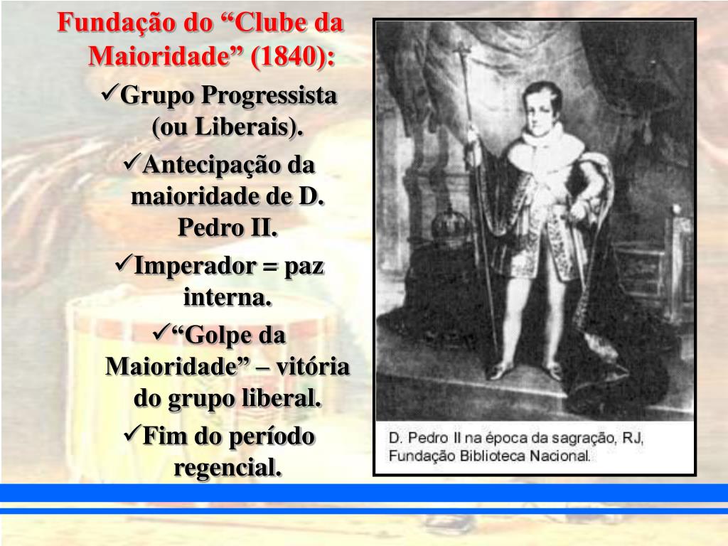 Fundação do “Clube da Maioridade” (1840): • Grupo Progressista (ou Liberais). • Antecipação da maioridade de D. Pedro II. • Imperador = paz interna. • “Golpe da Maioridade” – vitória do grupo liberal. • Fim do período regencial.