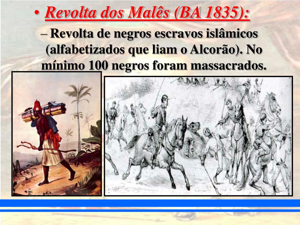 Revolta dos Malês (BA 1835): • Revolta de negros escravos islâmicos (alfabetizados que liam o Alcorão). No mínimo 100 negros foram massacrados.