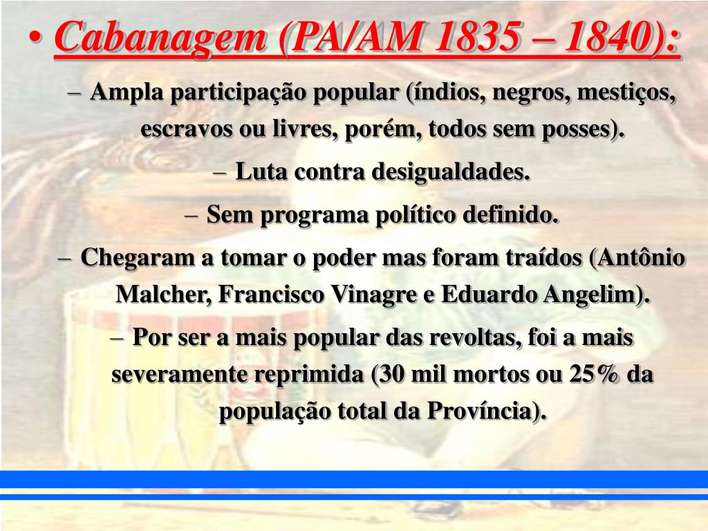 Cabanagem (PA/AM 1835 – 1840): • Ampla participação popular (índios, negros, mestiços, escravos ou livres, porém, todos sem posses). • Luta contra desigualdades. • Sem programa político definido. • Chegaram a tomar o poder mas foram traídos (Antônio Malcher, Francisco Vinagre e Eduardo Angelim). • Por ser a mais popular das revoltas, foi a mais severamente reprimida (30 mil mortos ou 25% da população total da Província).