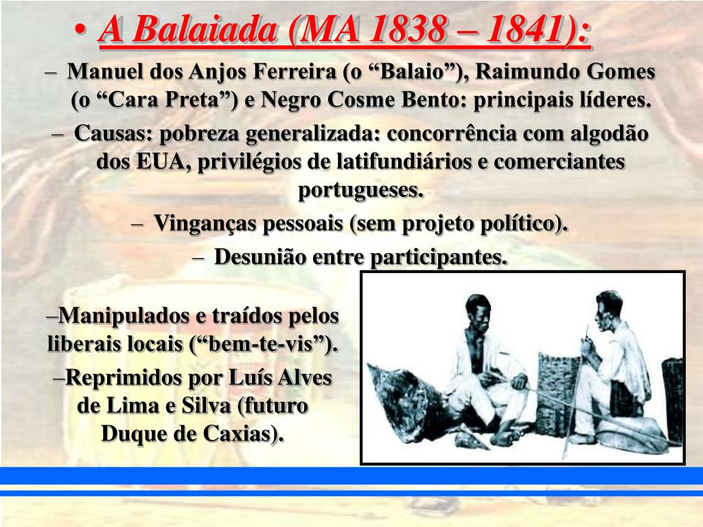 A Balaiada (MA 1838 – 1841): • Manuel dos Anjos Ferreira (o “Balaio”), Raimundo Gomes (o “Cara Preta”) e Negro Cosme Bento: principais líderes. • Causas: pobreza generalizada: concorrência com algodão dos EUA, privilégios de latifundiários e comerciantes portugueses. • Vinganças pessoais (sem projeto político). • Desunião entre participantes. • Manipulados e traídos pelos liberais locais (“bem-te-vis”). • Reprimidos por Luís Alves de Lima e Silva (futuro Duque de Caxias).