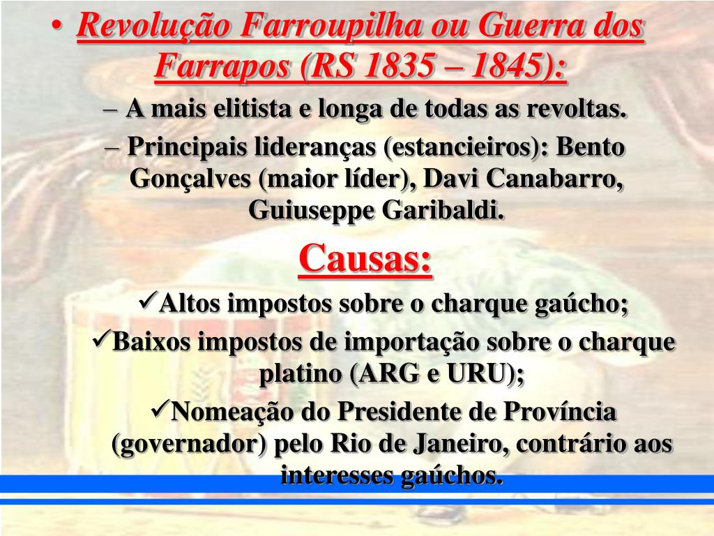 Revolução Farroupilha ou Guerra dos Farrapos (RS 1835 – 1845): • A mais elitista e longa de todas as revoltas. • Principais lideranças (estancieiros): Bento Gonçalves (maior líder), Davi Canabarro, Guiuseppe Garibaldi. Causas: • Altos impostos sobre o charque gaúcho; • Baixos impostos de importação sobre o charque platino (ARG e URU); • Nomeação do Presidente de Província (governador) pelo Rio de Janeiro, contrário aos interesses gaúchos.