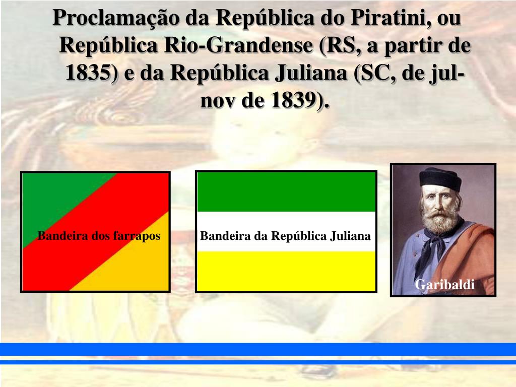 Proclamação da República do Piratini, ou República Rio-Grandense (RS, a partir de 1835) e da República Juliana (SC, de jul-nov de 1839). Bandeira dos farrapos Bandeira da República Juliana Garibaldi