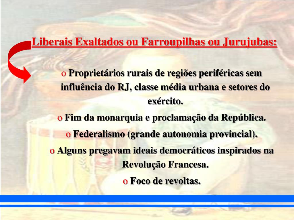 Liberais Exaltados ou Farroupilhas ou Jurujubas: • Proprietários rurais de regiões periféricas sem influência do RJ, classe média urbana e setores do exército. • Fim da monarquia e proclamação da República. • Federalismo (grande autonomia provincial). • Alguns pregavam ideais democráticos inspirados na Revolução Francesa. • Foco de revoltas.