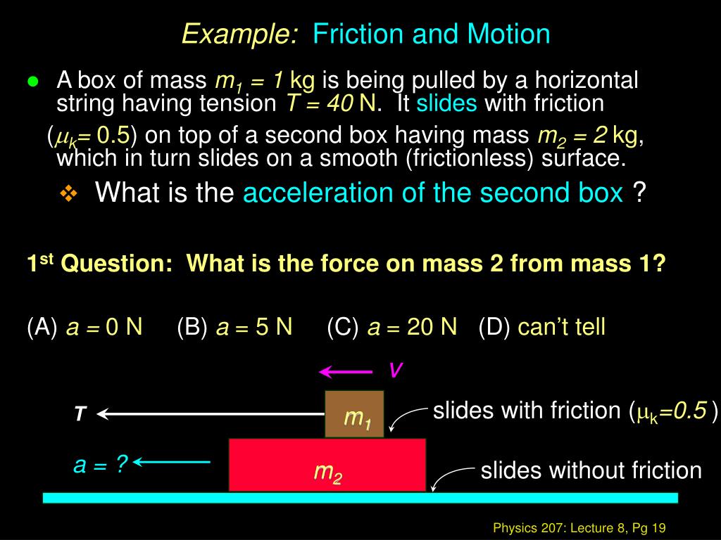 Example: Friction and Motion v • A box of mass m1 = 1 kg is being pulled by a horizontal string having tension T = 40 N. It slides with friction (mk= 0.5) on top of a second box having mass m2 = 2 kg, which in turn slides on a smooth (frictionless) surface. • What is the acceleration of the secondbox ? 1st Question: What is the force on mass 2 from mass 1? (A) a = 0 N (B) a = 5 N (C) a = 20 N(D) can’t tell slides with friction (mk=0.5) T m1 a = ? m2 slides without friction