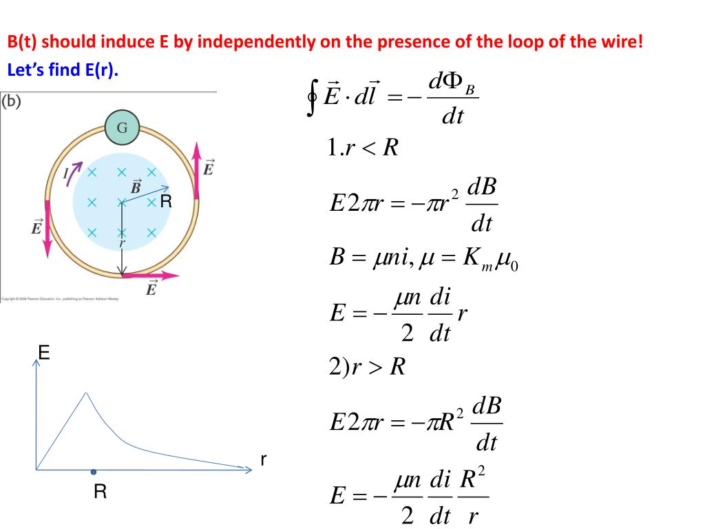 B(t) should induce E by independently on the presence of the loop of the wire! Let’s find E(r). R E r R
