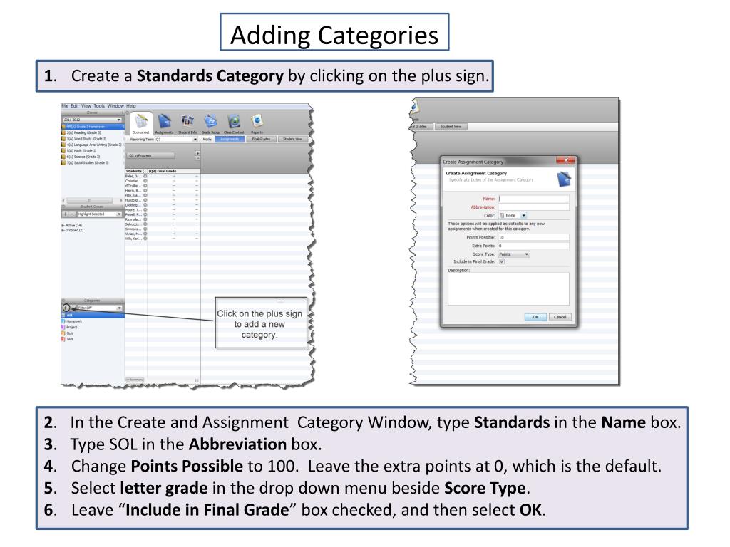 Adding Categories 1. Create a Standards Category by clicking on the plus sign. 2. In the Create and Assignment Category Window, type Standards in the Namebox. 3. Type SOL in the Abbreviation box. 4. Change Points Possible to 100. Leave the extra points at 0, which is the default. 5. Select letter grade in the drop down menu beside Score Type. 6. Leave “Include in Final Grade” box checked, and then select OK.
