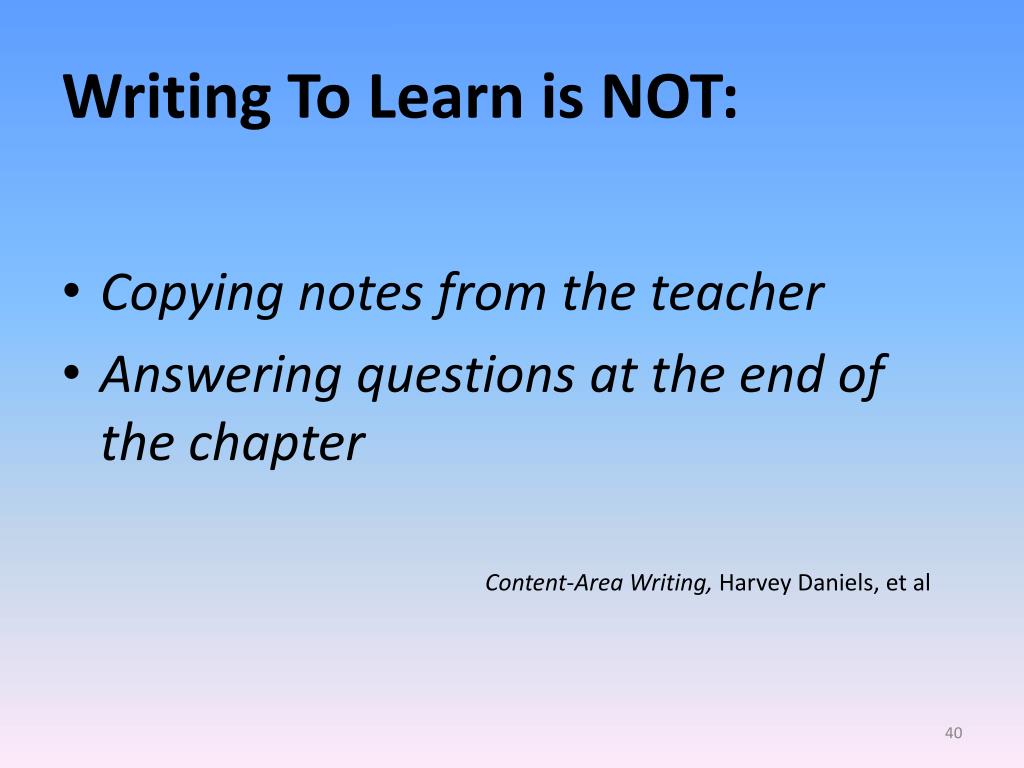 Writing To Learn is NOT: • Copying notes from the teacher • Answering questions at the end of the chapter Content-Area Writing, Harvey Daniels, et al