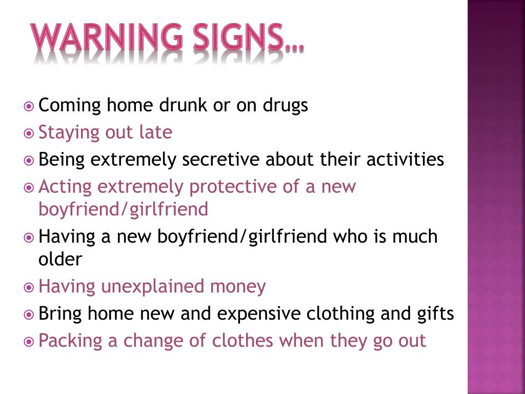 WarningSigns… • Coming home drunk or on drugs • Staying out late • Being extremely secretive about their activities • Acting extremely protective of a new boyfriend/girlfriend • Having a new boyfriend/girlfriend who is much older • Having unexplained money • Bring home new and expensive clothing and gifts • Packing a change of clothes when they go out Resource: Sexually Exploited Children & Teens (www.sacramentosect.org)