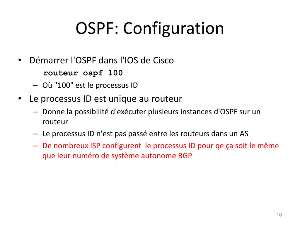 OSPF: Configuration • Démarrer l'OSPF dans l'IOS de Cisco routeur ospf 100 • Où "100" est le processus ID • Le processus ID est unique au routeur • Donne la possibilité d'exécuter plusieurs instances d'OSPF sur un routeur • Le processus ID n'est pas passé entre les routeurs dans un AS • De nombreux ISP configurent le processus ID pour qe ça soit le même que leur numéro de système autonome BGP