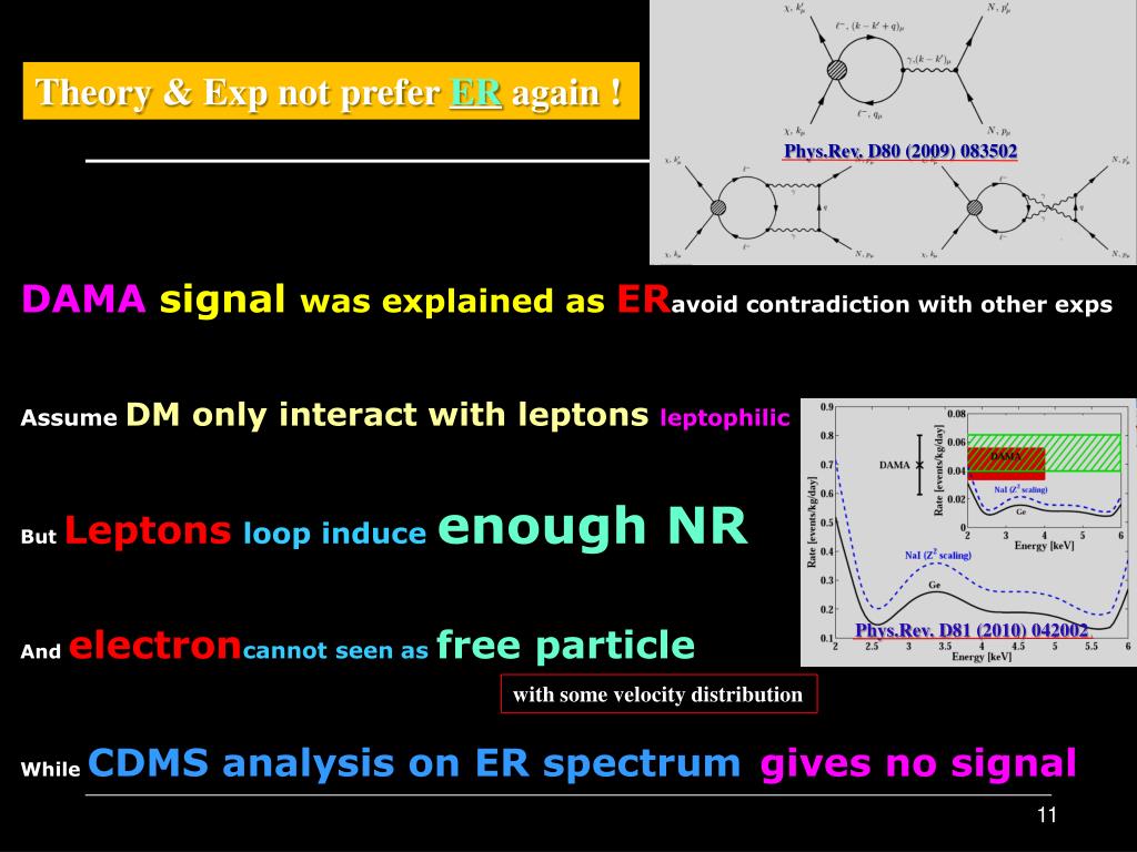 Theory& Exp not preferERagain ! Phys.Rev. D80 (2009) 083502 DAMA signal was explained as ERavoid contradiction with other exps Assume DM only interact with leptons leptophilic But Leptonsloop induce enough NR And electroncannot seen as free particle While CDMS analysis on ER spectrumgives no signal Phys.Rev. D81 (2010) 042002 with some velocity distribution