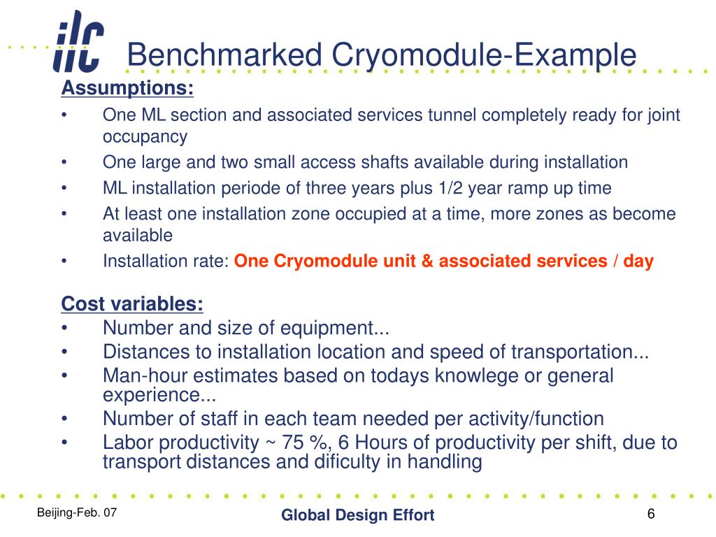 Benchmarked Cryomodule-Example Assumptions: • One ML section and associated services tunnel completely ready for joint occupancy • One large and two small access shafts available during installation • ML installation periode of three years plus 1/2 year ramp up time • At least one installation zone occupied at a time, more zones as become available • Installation rate: One Cryomodule unit & associated services / day Cost variables: • Number and size of equipment... • Distances to installation location and speed of transportation... • Man-hour estimates based on todays knowlege or general experience... • Number of staff in each team needed per activity/function • Labor productivity ~ 75 %, 6 Hours of productivity per shift, due to transport distances and dificulty in handling Global Design Effort