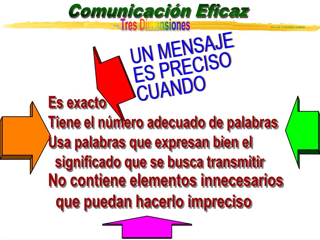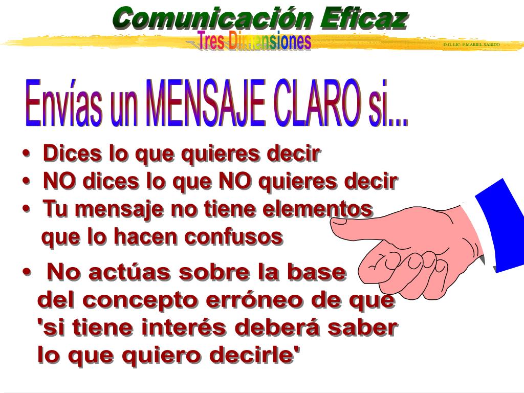 • Dices lo que quieres decir • NO dices lo que NO quieres decir • Tu mensaje no tiene elementos que lo hacen confusos • No actúas sobre la base del concepto erróneo de que 'si tiene interés deberá saber lo que quiero decirle' Envías un MENSAJE CLARO si...