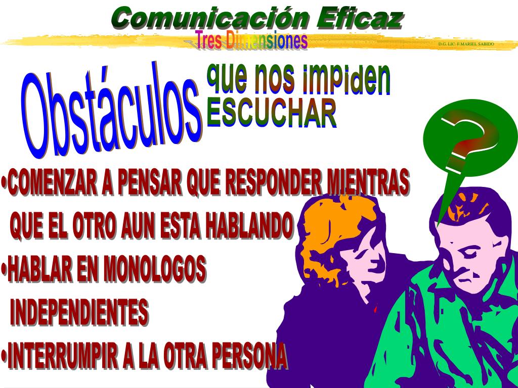 ? que nos impiden ESCUCHAR Obstáculos •COMENZAR A PENSAR QUE RESPONDER MIENTRAS QUE EL OTRO AUN ESTA HABLANDO •HABLAR EN MONOLOGOS INDEPENDIENTES •INTERRUMPIR A LA OTRA PERSONA