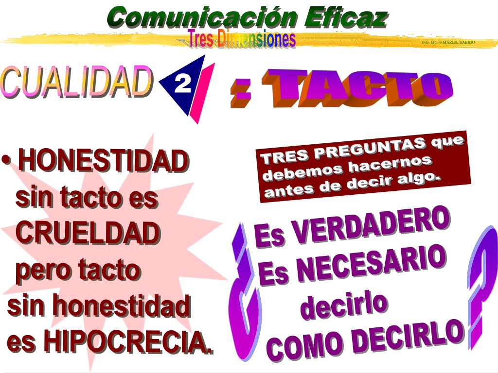 CUALIDAD : TACTO TRES PREGUNTAS que debemos hacernos antes de decir algo. • HONESTIDAD sin tacto es CRUELDAD pero tacto sin honestidad es HIPOCRECIA. Es VERDADERO Es NECESARIO decirlo COMO DECIRLO ¿ ¿