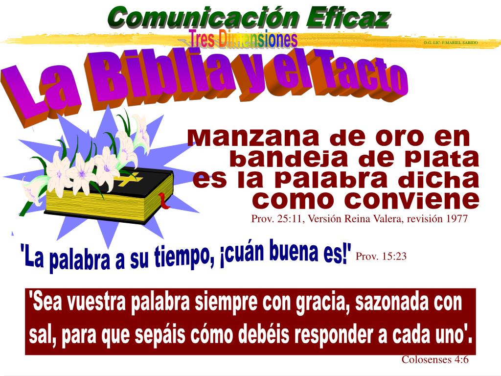 La Biblia y el Tacto Manzana de oro en bandeja de plata es la palabra dicha como conviene Prov. 25:11, Versión Reina Valera, revisión 1977 'La palabra a su tiempo, ¡cuán buena es!' Prov. 15:23 'Sea vuestra palabra siempre con gracia, sazonada con sal, para que sepáis cómo debéis responder a cada uno'. Colosenses 4:6
