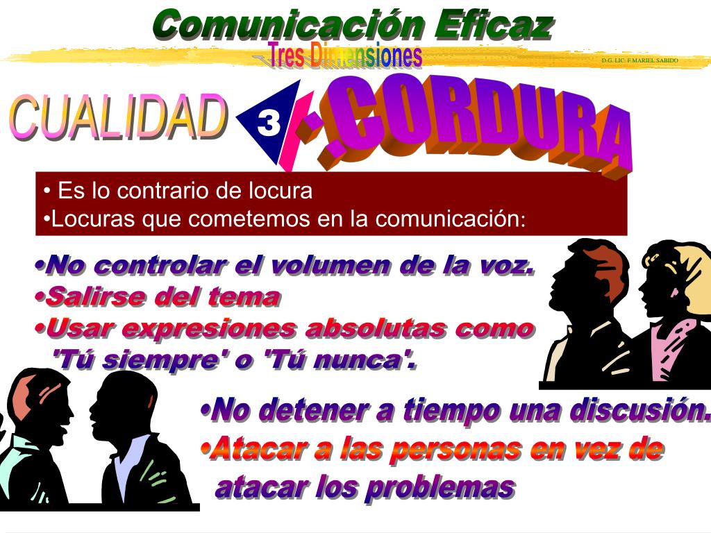CUALIDAD :CORDURA • Es lo contrario de locura •Locuras que cometemos en la comunicación: •No controlar el volumen de la voz. •Salirse del tema •Usar expresiones absolutas como 'Tú siempre' o 'Tú nunca'. •No detener a tiempo una discusión. •Atacar a las personas en vez de atacar los problemas