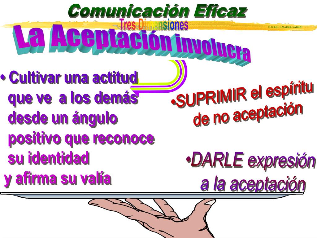 La Aceptación involucra • Cultivar una actitud que ve a los demás desde un ángulo positivo que reconoce su identidad y afirma su valía •SUPRIMIR el espíritu de no aceptación •DARLE expresión a la aceptación